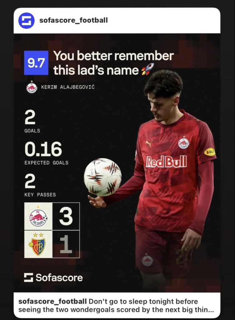 Remember this name. Zapamtite ovo ime. To su bile najčešća poruka specijaliziranih fudbalskih stranica nakon što je Kerim Alajbegović, mladi igrač Salzburga, spakovao dva gola u mrežu Basela u pobjedi austrijskog predstavnika rezultatom 3:1 u pretposljednjem kolu Evropske lige.